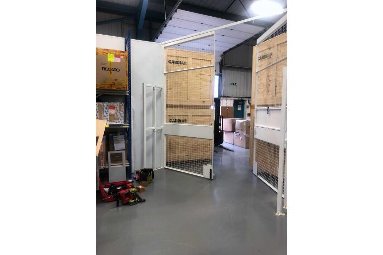 Our client NEEDED A PARTITIONING SYSTEM that looked good but more importantly meet the industry certification requirements for aircraft refurbishment. We offered a solution using single solid partitioning to restict access to workshop and mezzanine floor areas. The single door had push lock release handle to exit in case of a emergency. Also large key locking mesh double doors that offered resricted access in to main workshop. The main double doors are fitted with a hatch and shelf that ensures parts a controlled, secured dispatch and not open to general workforce outside the partition. The double doors are mounted on large secure posts for stability as existing partition did not offer the strenght to support framework and slide floor bolts for added strenght. Also doors are fitted with castors to support the doors at all times when opening and closing them.